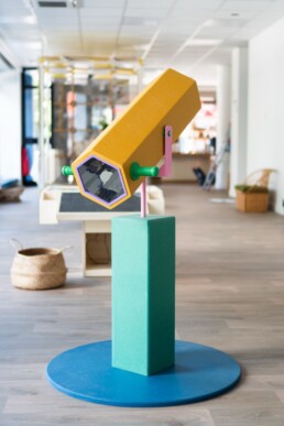 Conception et fabrication d’une paroi recouverte de miroirs déformants, séparation entre des espaces de bureaux et une crèche d’entreprise créant entre les deux une série de jeux optiques...